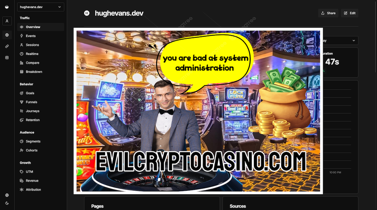 With all that said, you could imagine I was particularly annoyed when checking my web analytics dashboard to find that not only had someone hacked my homelab: they had somehow managed to inject a crypto casino ad into the web app html. I didn't actually get a screenshot of this but it looked a little something like this: