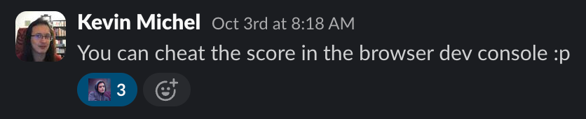 One thing that really caught my attention was that the game was very much not developer-proof as some of my clever colleagues pretty quickly figured out how to cheat the leaderboard and gave themselves arbitrary scores.