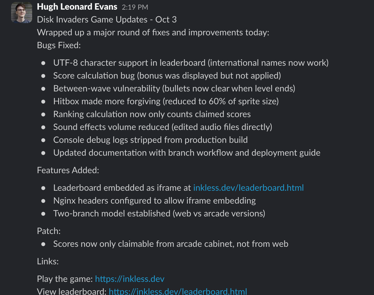 After a busy couple of days fixing everything I could and responding to the helpful feedback from my colleagues I shipped v3. I shared an update in the #disk-invaders channel to share my progress with everyone who gave feedback and tested the game.