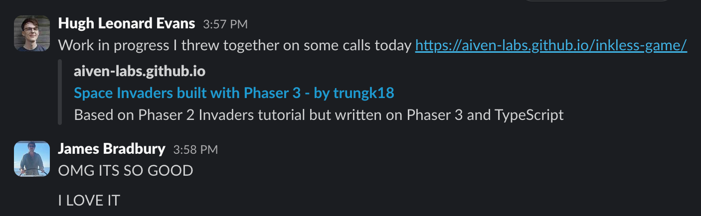James shared the game at the company all-hands and we were immediately inundated with feedback. We created a separate #disk-invaders channel in Slack so people could share bugs they’d found and make suggestions for improvements.