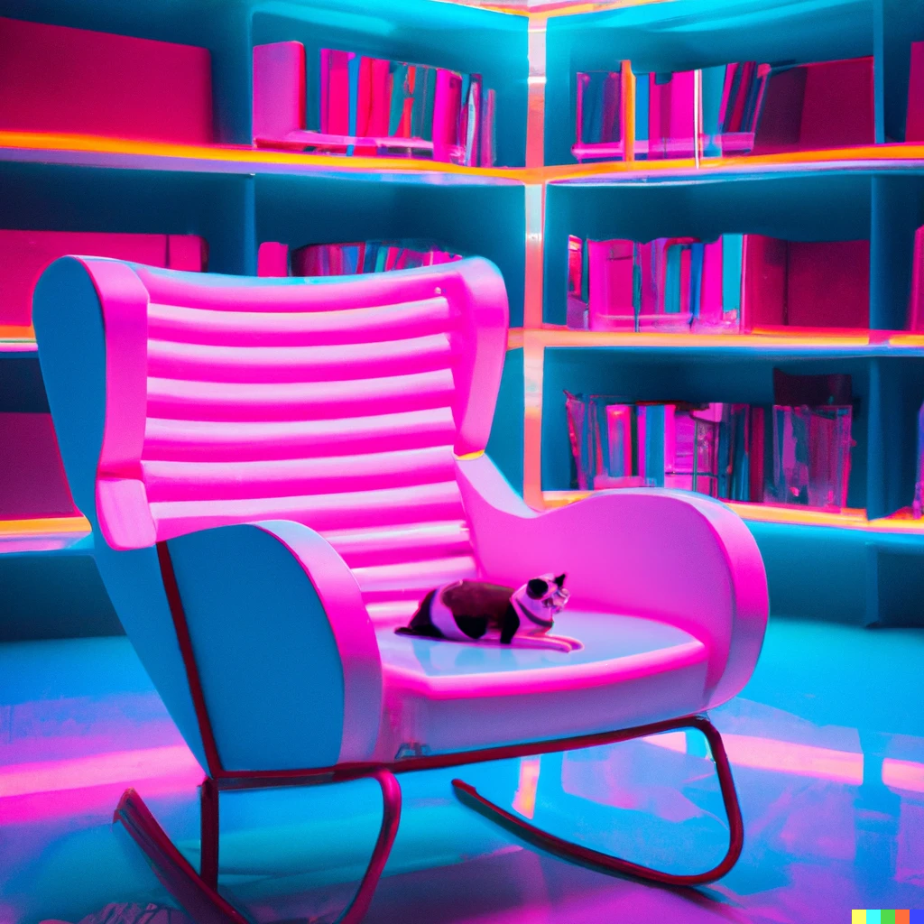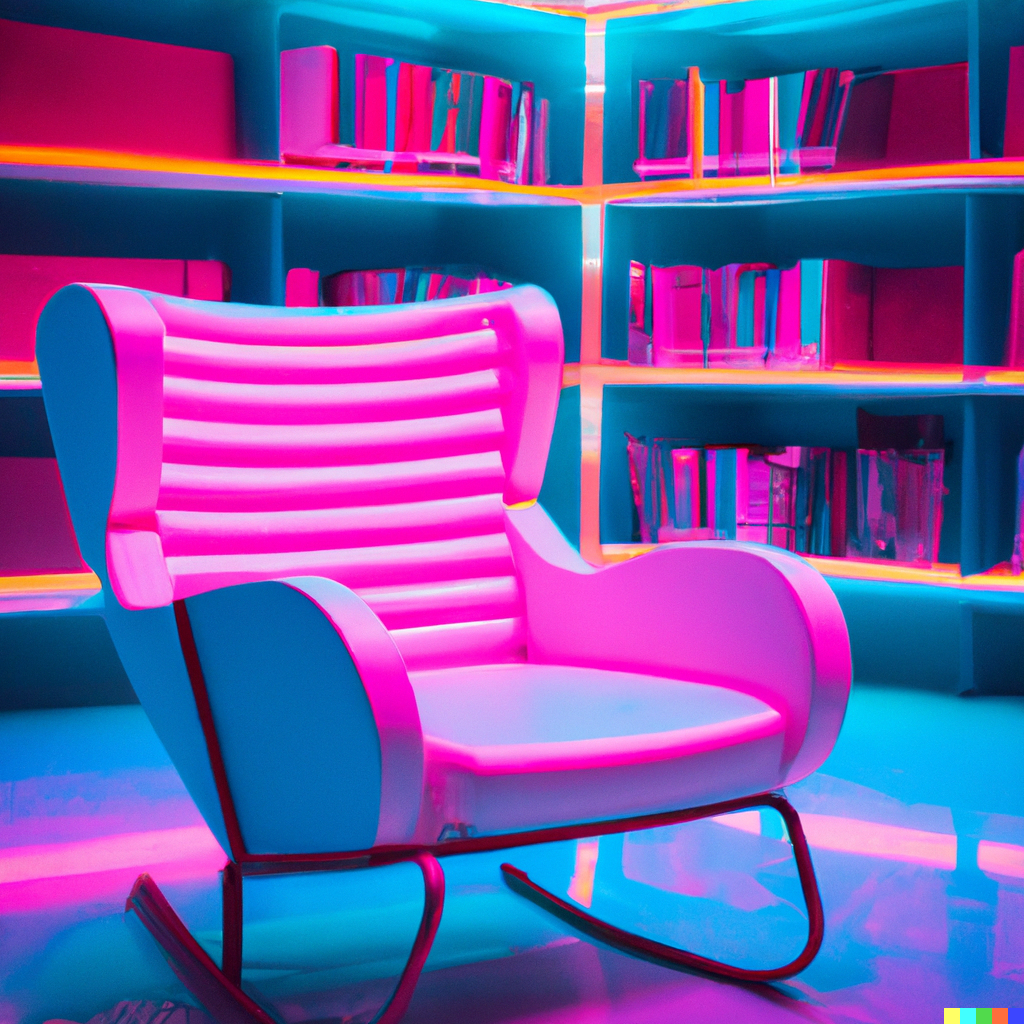 comfortable armchair in a library neon, pink, blue, geometric, futuristic, ‘80s