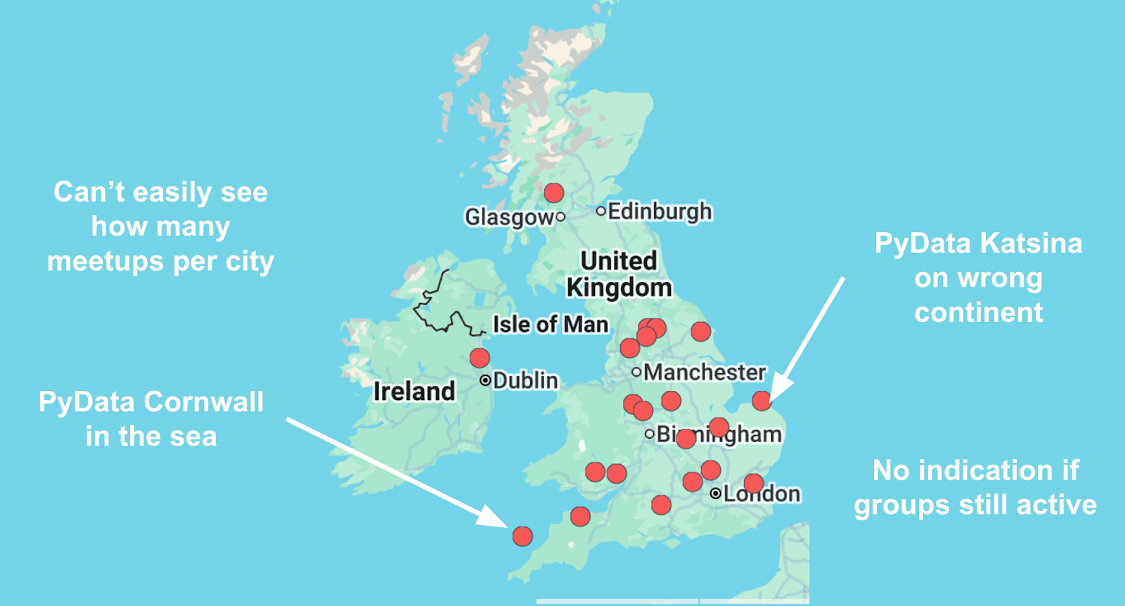Despite its flaws I’ve always found this map particularly inspiring, much like pythondeadlin.es and other similar resources, it showcases the sheer scale of the international Python community, and serves as something of an invitation to go seek out like-minded people the world over. For all that inspiration though, there's a major issue with it: it’s built and maintained by Meetup. I’ve spent a lot of time complaining about Meetup over the last few years (no hate to the folks actually building the Meetup platform, I’m sure it’s very difficult trying to get work done in the kind of environment private equity takeovers create). It's a tool I rely on heavily as a community organiser, but if we zoom in specifically on the UK position of the map we can see the issues with Meetup’s map of PyData communities.